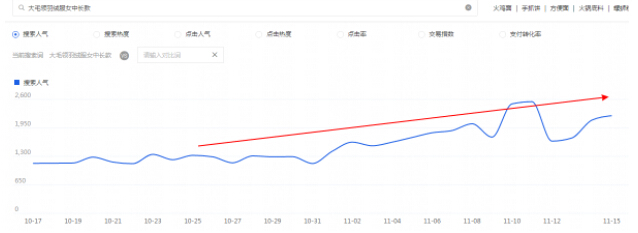 这里要使用的数据采集工具是淘宝官方的生意参谋市场洞察标准版,在市场--搜索分析--输入关键词,在这里我输入“大毛领羽绒服女中长款”首先我们要看的是这个关键词的近期的市场趋势是上升还是下滑,如果是下滑趋势,那就要考虑下这款产品是否能作为店铺主推款了。