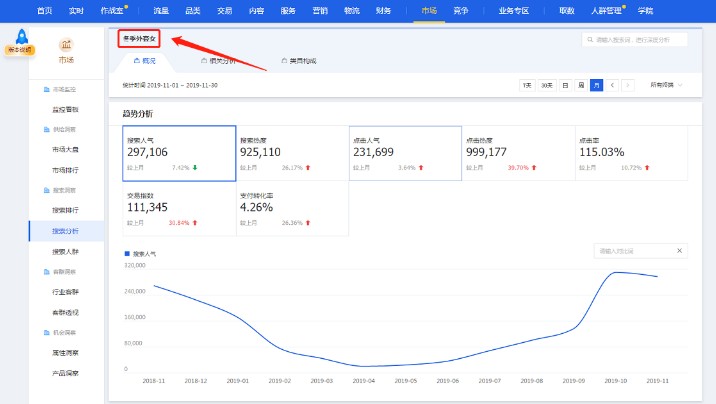 在生意参谋-市场-搜索分析中,我们搜索某个季节性产品类目词,可以看到关于这个关键词一整年的流量情况。