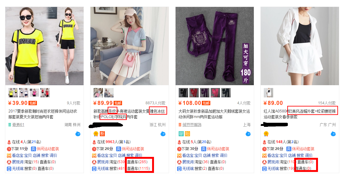 二 通过上面的搜索词查找规律和搜索人气最高的词记录下来。关键词本身包含搜索人气和转化率1.花钱方法:生意参谋里面市场行情查看自己关键词是否都有高的搜索人气和转化。2.免费方法:店侦探查看有销量的同行无线端搜索词,记录排名高的词。多找几个同行进行记录。三 与宝贝匹配度高和精准这里我拿个例子来说下,这里有两个不同的店铺做个同类产品,价格都是一样的,而两个分别是这个页面的第一和第二名,第一的已经一千多销量第二名几百销量,但是重点我也框出来了,一个完全靠直通车推的,一个靠自然搜索做的。为什么把他们放在一起,因为这两个店铺,同样的客单价,销量高的标题做的没第二个好销量低的好,因为它的标题是包含条纹和冰丝,而我在主图里看不出这两个属性。而第二个宝贝标题是连帽外套和松紧短裤非常符合主图。