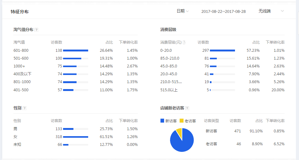 根据上图,我们可以做出一个简单的分析,0-20元的人群转化率才1.01%,他的消费能力很弱,这部分人群占了总流量的57%,另外人群呢是45元以上人群,转化比较好。大家可以看出来,在这个店铺可以说是消费层级越高的人,转化率也会越高。店铺低客单流量这么多可以说是因为前期引流没注意客单方面,导致人群标签没打好,那么我们可以通过关联营销来增加客单价,使店铺人群定位往高客单人群发展。