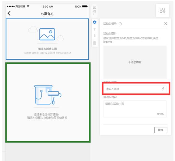 篮框的位置是活动头图,也就是手淘宝贝页面里可以看到的,绿框的位置是自定义区,可以放一些活动规则什么的,红框的位置放入我们刚刚在“无线互动”工具里生成的活动链接,保存以后效果是这样的。