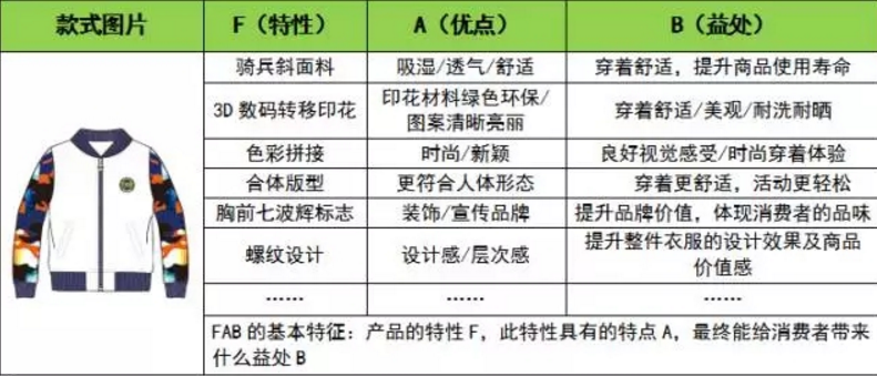 独特的卖点就是指吸引消费者购买产品或者服务的理由,我们必须通过差异化调出独立的卖点,所谓的独特的卖点实际上就是能够吸引买家眼球的独特的利益,也是广告的诉求点或者独特的卖点。 卖点定位能够一句话能够传达的竞争优势 提到阿芙就能想到精油,提到裂帛就能想到民族风,提到贝尔莱德就能想到挂烫机,提到小狗电器就能想到吸尘器,提到韩都衣舍就能想到韩国风,那么提到你你能想到什么呢?提到你,你的买家能想到什么呢?也就说卖点就是一句话或者几个字就能传达的竞争优势。卖点的三个特点:(1)每则活动必须想顾客提出一个独一无二卖点;(2)这个卖点必须有足够促销力,能打动顾客购买;(3)有长期传播的价值及品牌辨识度。 如何提炼卖点——FAB法则