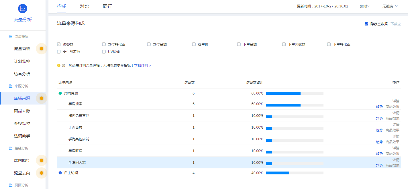 没有定制流量纵横的小伙伴可以从生意参谋——流量——店铺来源来分析。因为不同入口流量的人群属性不同,支付转化率不同。